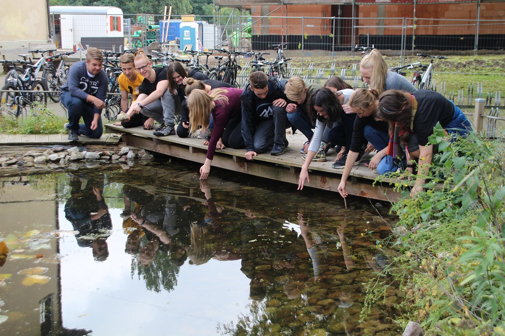 Im Jahr 2013 begannen wir damit, unser Schulgelände so umzugestalten, dass es ein kleinräumiges Mosaik vielfältiger Lebensräume beinhaltet. Seit dieser Zeit wurde eine Teilfläche von der Pflege ausgenommen, sodass jetzt hier ein sehr anschauliches Exempel für Bewaldungs-Sukzession zu beobachten ist. Der im Sommer 2014 angelegte Teich liefert uns nicht nur mikroskopische Präparate, sondern beherbergt auch eine Vielzahl an Wassertieren. Hinzu kommen eine Wildblumenwiese, ein Insektenhotel, ein Komposthaufen und ein Steingarten. Das Ensemble ist so angelegt, dass es in den kommenden Jahren um weitere Bestandteile erweitert werden kann.
